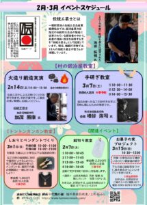 2026年2月3月イベントスケジュールのチラシが完成しました。 2026年1月30日 2026年2月3月イベントスケジュールのチラシが完成しました。 市内公民館等、公共施設に配布します。 偶数月開催の火造り鍛造実演、奇数月開催の手研ぎ教室のほか、 ワークショップの予定もありますので、ぜひご来館ください。