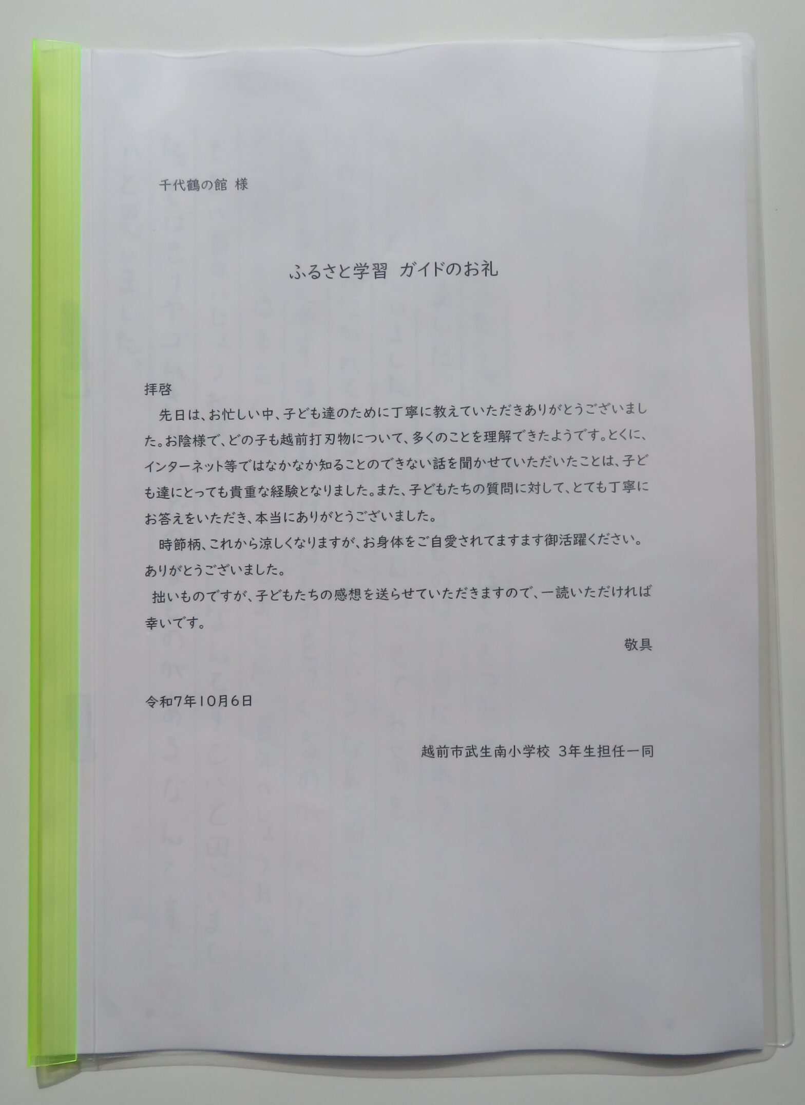 2025年9月17日に校外学習で越前千代鶴の館にお越しいただきました、 越前市武生南小学校3年生の皆さんから、お手紙をいただきました。 ファイルにして館内のギャラリーに配架させていただきました。 ありがとうございました。