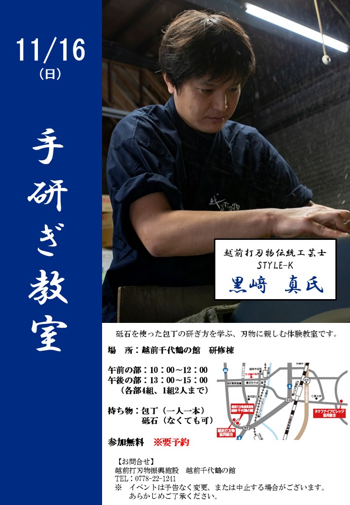 砥石を使った包丁の研ぎ方を学ぶ、刃物に親しむ体験教室です。 日程 2025年11月16日(日曜日) 午前の部:10時から12時まで 午後の部:13時から15時まで 各部4組(1組2人まで)所要時間は30分です。 講師 伝 …