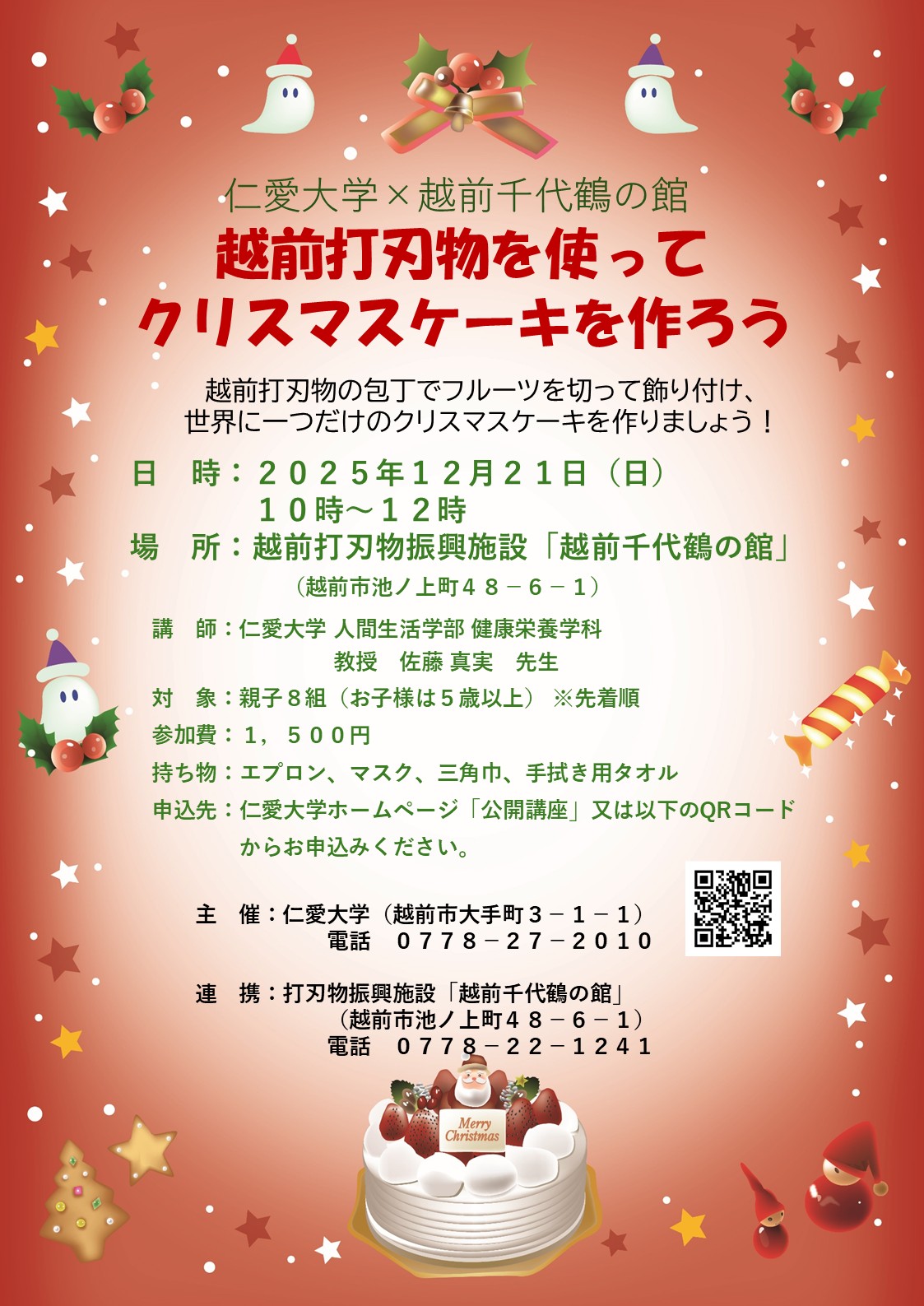 ※定員に達しましたので、受付を終了させていただきました。 仁愛大学公開講座「越前打刃物を使ってクリスマスケーキを作ろう」を 越前打刃物振興施設「越前千代鶴の館」で開催します。 越前打刃物の包丁でフルーツを切 …
